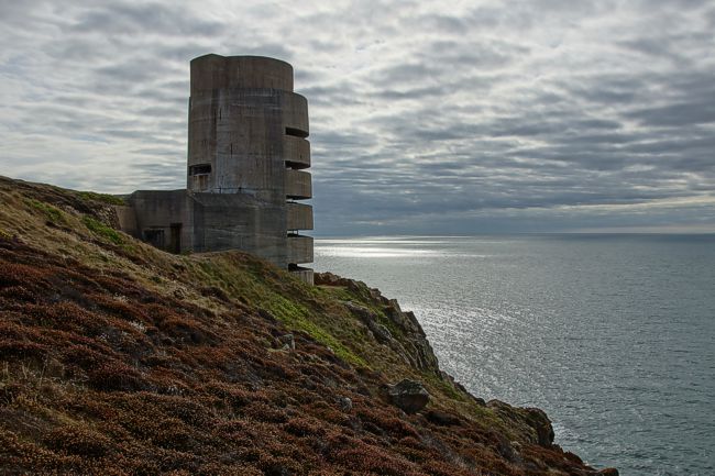 De Kanaaleilanden voor de kust van Frankrijk waren Brits grondgebied, veroverd door de Duitsers werden ze omgetoverd tot gigantische bunkerforten. Hierboven staat de observatietoren van de 'Moltke battterij'.